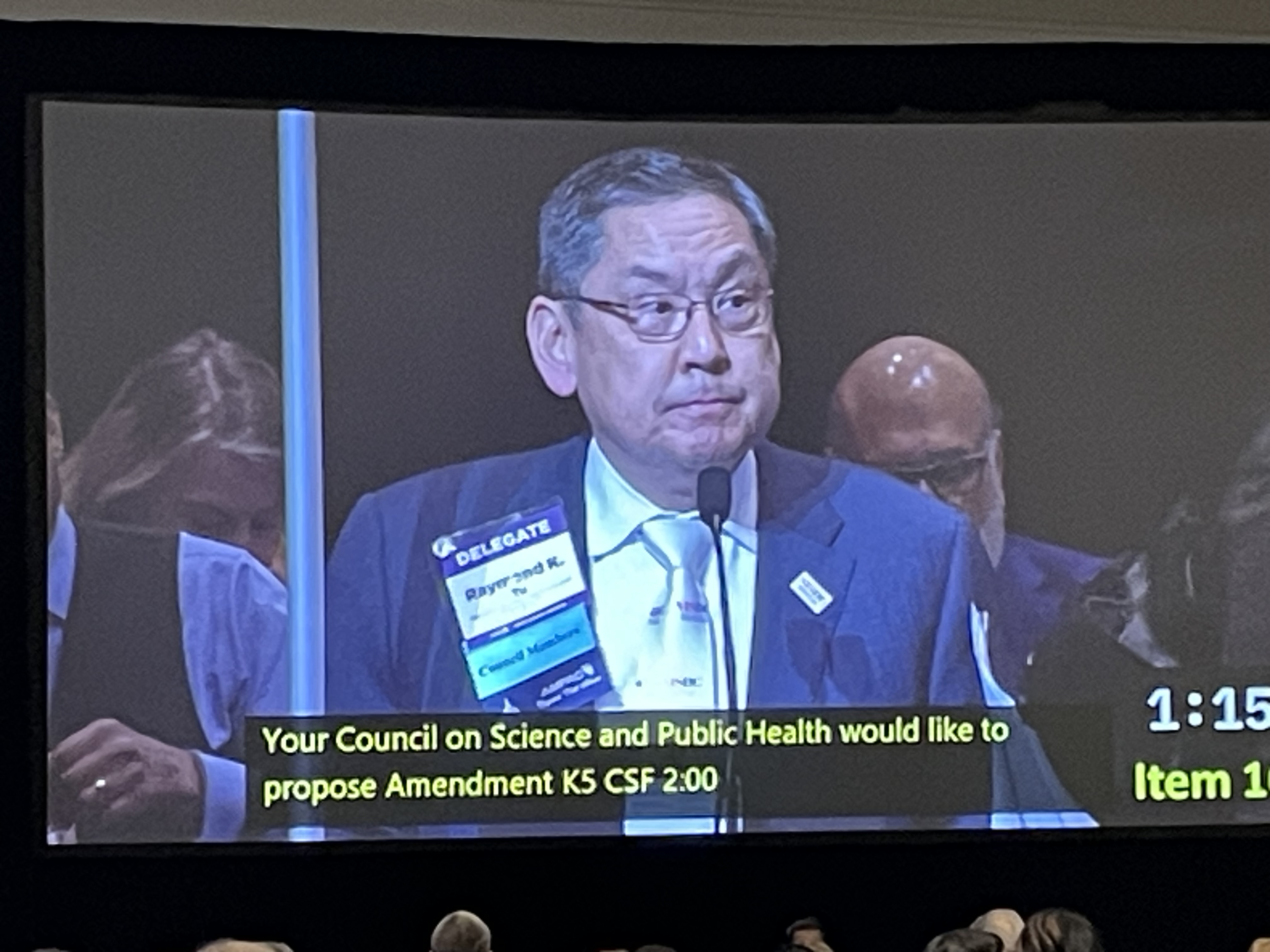 The DC delegation introduced one resolution and backstopped another that became AMA policy. Resolution 901 would align AMA policy with more precise science by differentiating between different types of ultra-processed foods. Generally the media and public assume all ultra-processed foods are bad for health, but there are some vegan and non-diary alternatives that fall into this definition. The resolution makes sure that soymilk is not treated the same as hot dogs in dietary guidelines. The second resolution establishes policy on fire risk standards for civilian and non-industrial clothing. The resolution points out the recent tragedies in New York and DC of people being lit on fire, and how fire-retardant clothing could have helped save their lives.
